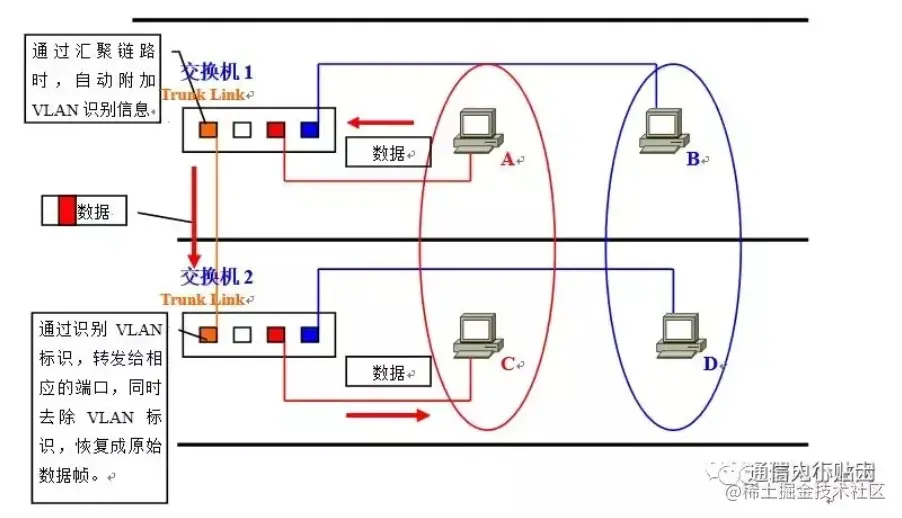 A发送的数据帧从交换机1经过汇聚链路到达交换机2时,在数据帧上附加了表示属于红色VLAN的标记。