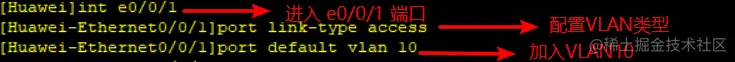 [Sw1-Ethernet0/0/1]port link-type access #指明vlan类型