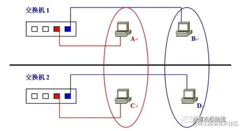 这时,如果在交换机上生成红、蓝两个VLAN;
