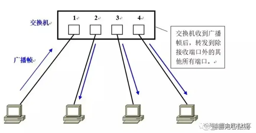 首先,在一台未设置任何VLAN的二层交换机上,任何广播帧都会被转发给除接收端口外的所有其他端口上泛滥。例如,计算机A发送广播信息后,会被转发给端口2、3、4。