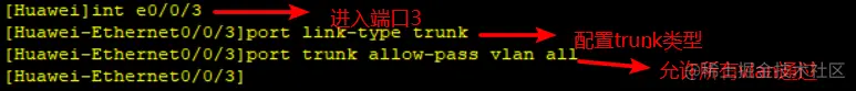 [Sw2-Ethernet0/0/3]port trunk allow-pass vlan all #允许所有vlan通过