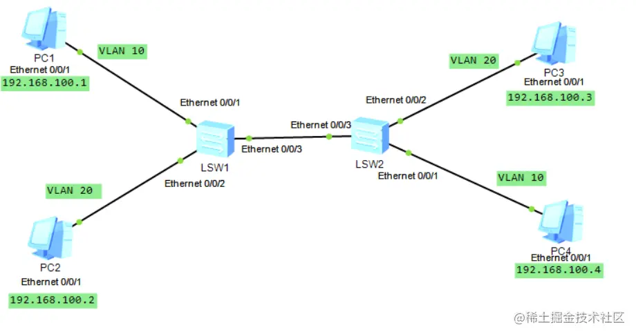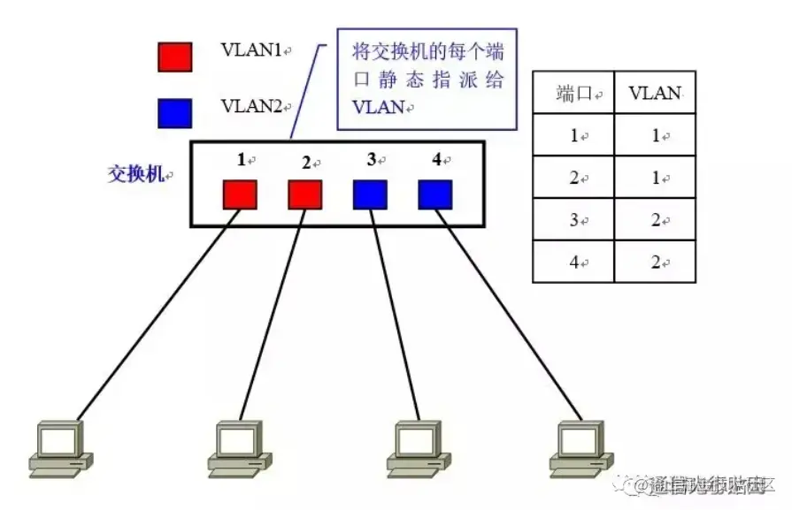 例如:计算机连在端口1时,端口1属于VLAN10;而计算机连在端口2时,则是端口2属于VLAN10。