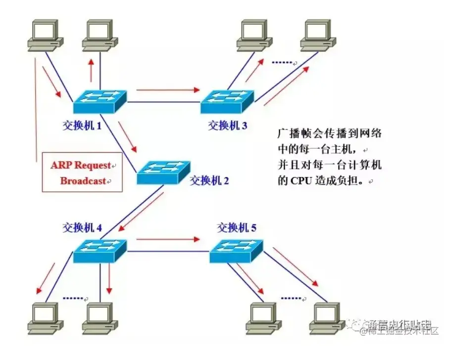 交换机1收到广播帧(ARP请求)后,会将它转发给除接收端口外的其他所有端口,也就是泛滥了。接着,交换机2收到广播帧后也会泛滥。交换机3、4、5也还会泛滥。最终ARP请求会被转发到同一网络中的所有客户机上,这也就是网络风暴。