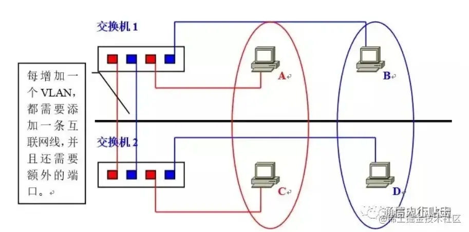 最简单的方法,自然是在交换机1和交换机2上各设一个红、蓝VLAN专用的接口并互联了。