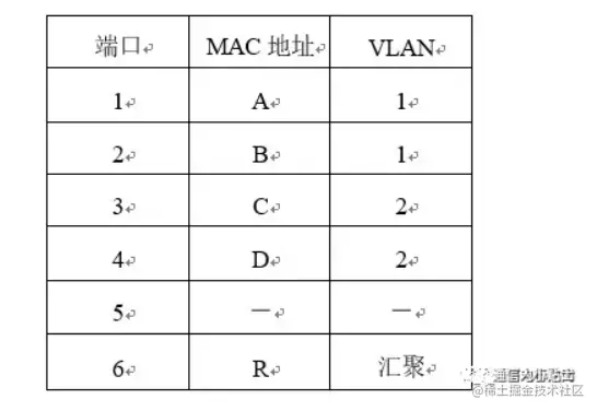 红色VLAN(VLANID=1)的网络地址为192.168.1.0/24,蓝色VLAN(VLANID=2)的网络地址为192.168.2.0/24。各计算机的MAC地址分别为A/B/C/D,路由器汇聚链接端口的MAC地址为R。交换机通过对各端口所连计算机MAC地址的学习,生成如下的MAC地址列表。