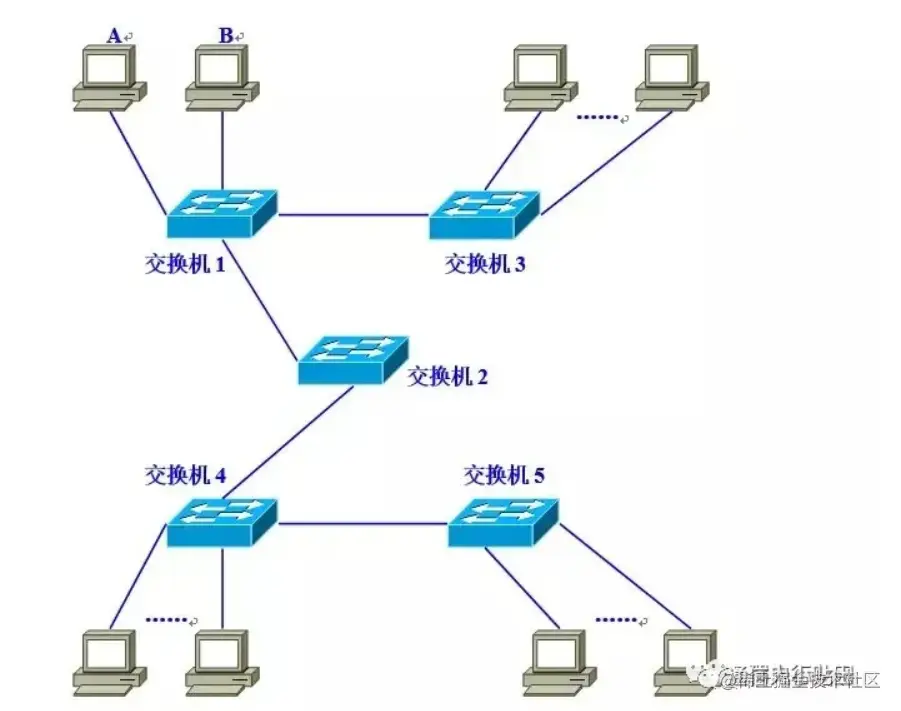 图中,是一个由5台二层交换机(交换机1~5)连接了大量客户机构成的网络。假设这时,计算机A需要与计算机B通信。在基于以太网的通信中,必须在数据帧中指定目标MAC地址才能正常通信,因此计算机A必须先广播“ARP请求(ARP Request)信息”,来尝试获取计算机B的MAC地址。