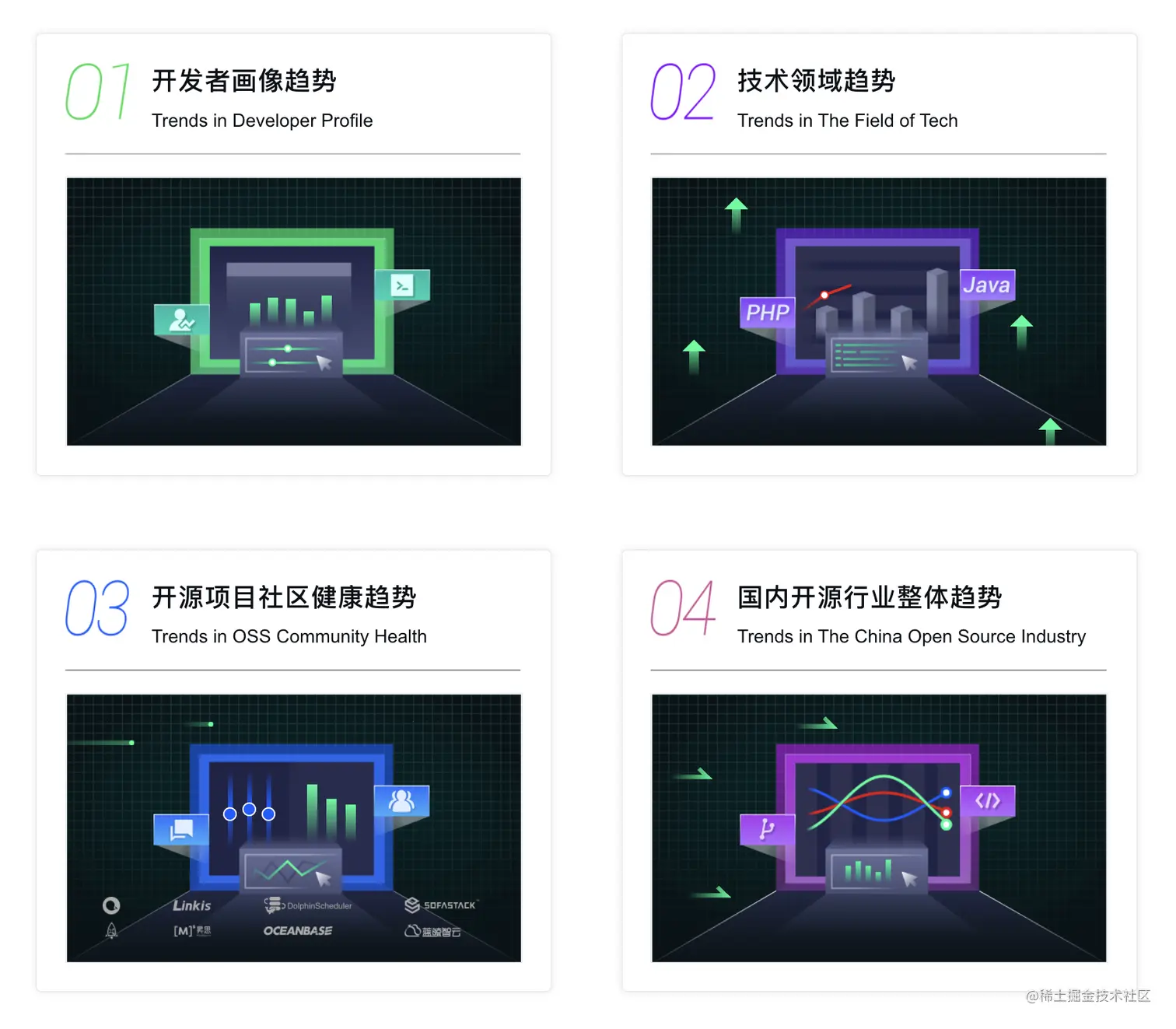 结合开源开发者问卷调查和针对 Gitee 平台的数据分析,以及行业观察等方式,本报告分为四大模块: