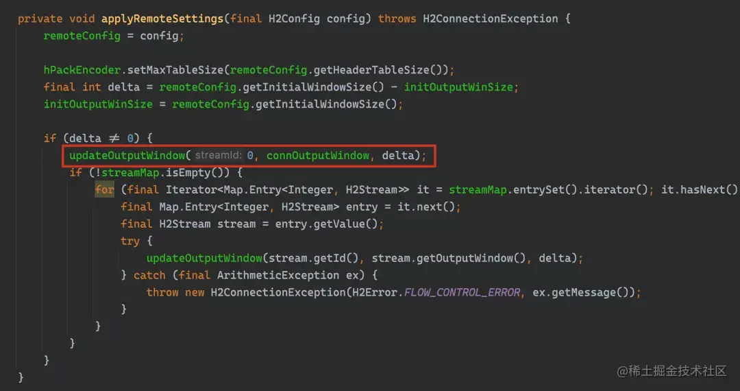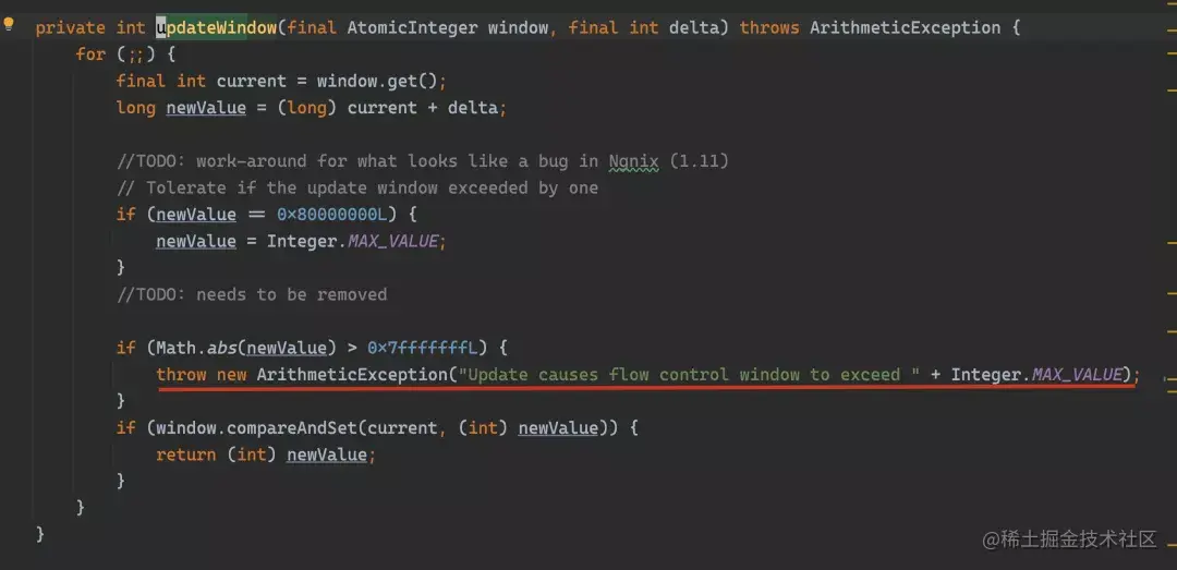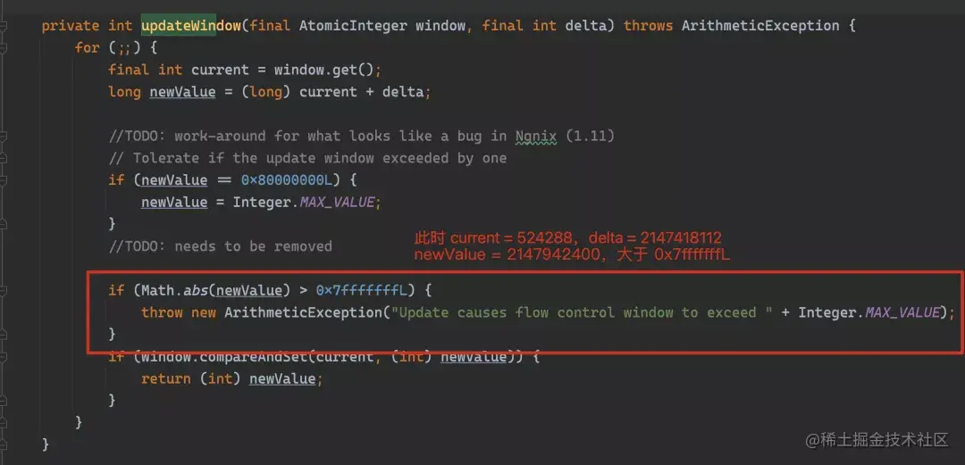 那么回到开篇的问题,我们以 URL www.sysgeek.cn/ 为例,通过在本地做代码 debug 发现,最终抛异常的原因在于接收到 WINDOW_UPDATE 帧后,更新后窗口大小值大于 2^32 - 1 导致抛异常: