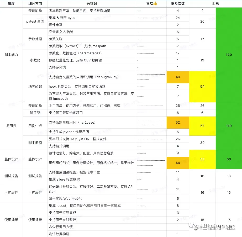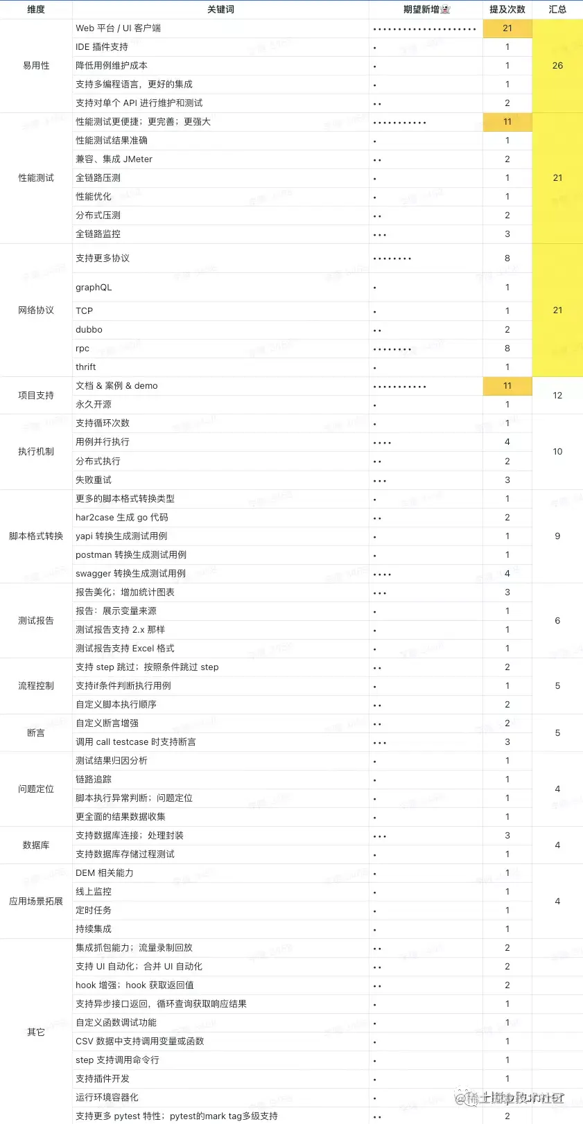 统计说明:统计次数都是基于针对具体维度的评价,笼统的描述不计入统计,例如「非常好用」、「都喜欢」等。同时单个用户针对多个维度的具体评价,都会计入到统计数据。 如果大家期望看到原始的问卷内容,可在公众号 HttpRunner 中发送「首轮问卷原始内容」获得查看链接(已去除用户个人相关信息)。