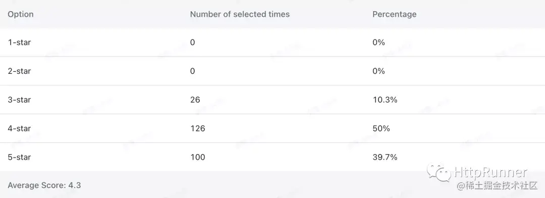 HttpRunner 当前整体满意度平均分 4.3。欣喜的是大家普遍给出的评分都是 4 星和 5 星,没有给出 1 星和 2 星的用户,在此非常感谢大家的认可和鼓励!