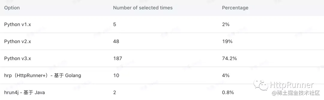 HttpRunner 最开始是使用 Python 开发的,而当前采用 Golang 开发的 HttpRunner+ 还未开始推广,因此使用 Python 版的用户占比 95.2%,符合预期。