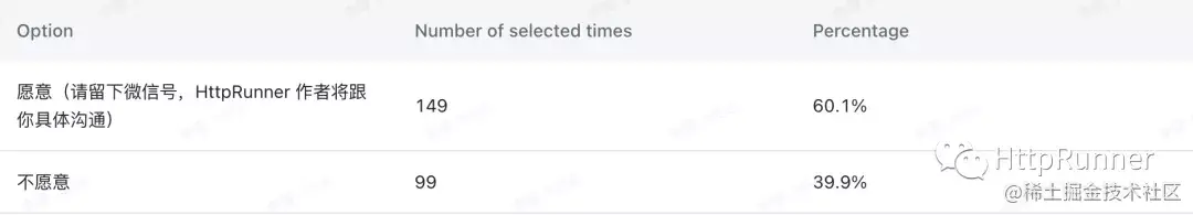 愿意与 HttpRunner 共创成功案例的用户达到了 60.1%,着实令我感动。