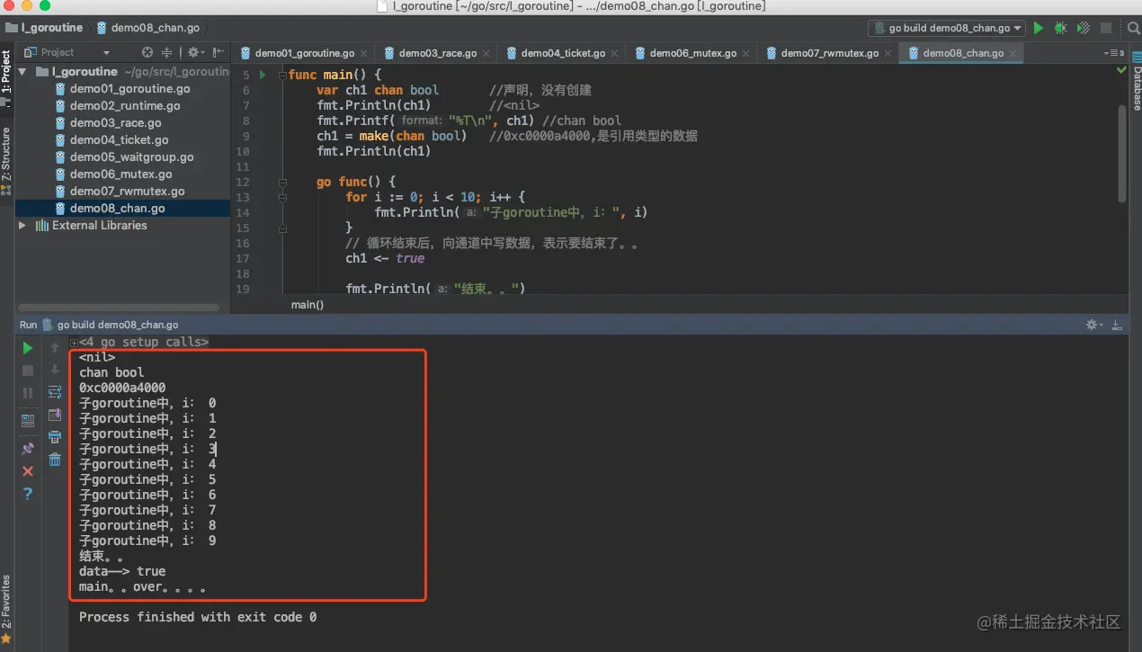 在上面的程序中,我们先创建了一个chan bool通道。然后启动了一条子Goroutine,并循环打印10个数字。然后我们向通道ch1中写入输入true。然后在主goroutine中,我们从ch1中读取数据。这一行代码是阻塞的,这意味着在子Goroutine将数据写入到该通道之前,主goroutine将不会执行到下一行代码。因此,我们可以通过channel实现子goroutine和主goroutine之间的通信。当子goroutine执行完毕前,主goroutine会因为读取ch1中的数据而阻塞。从而保证了子goroutine会先执行完毕。这就消除了对时间的需求。在之前的程序中,我们要么让主goroutine进入睡眠,以防止主要的Goroutine退出。要么通过WaitGroup来保证子goroutine先执行完毕,主goroutine才结束。