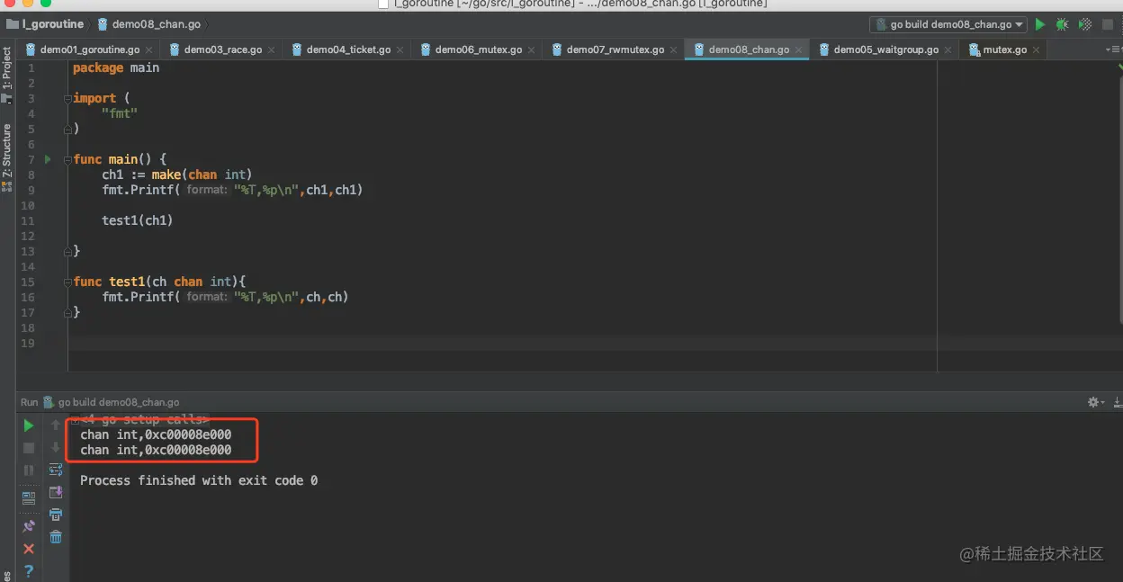 channel是引用类型的数据,在作为参数传递的时候,传递的是内存地址。