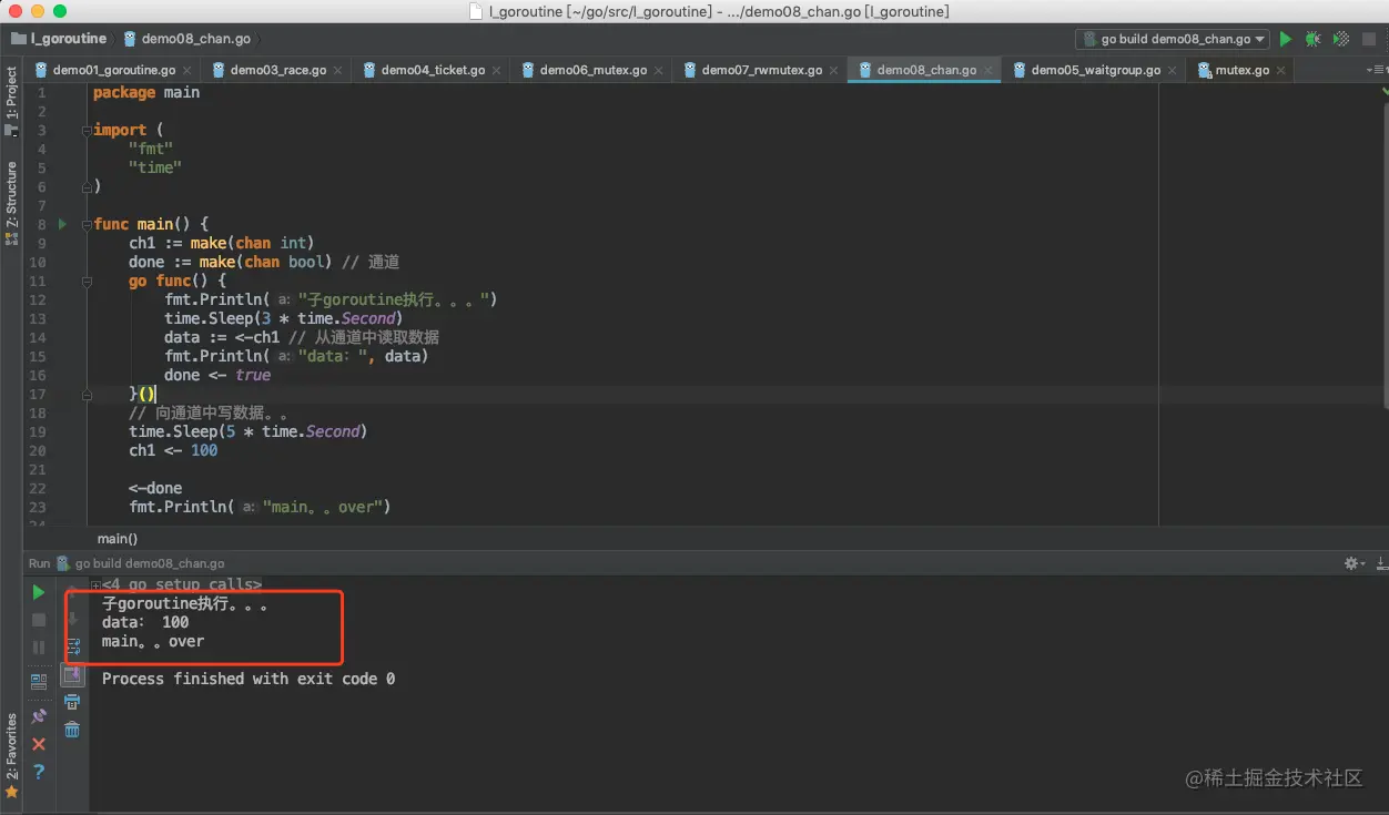 示例代码:以下代码加入了睡眠,可以更好的理解channel的阻塞