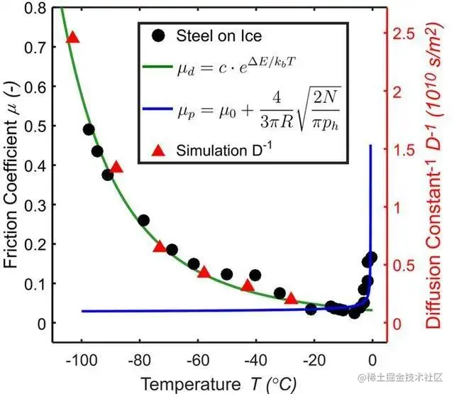 荷兰阿默斯特丹大学和德国马克斯·普朗克高分子研究所的学者们运用分子动力学,模拟了钢在冰上滑行的实验,测量了在 -100°C 到 0°C 范围内冰的摩擦系数。