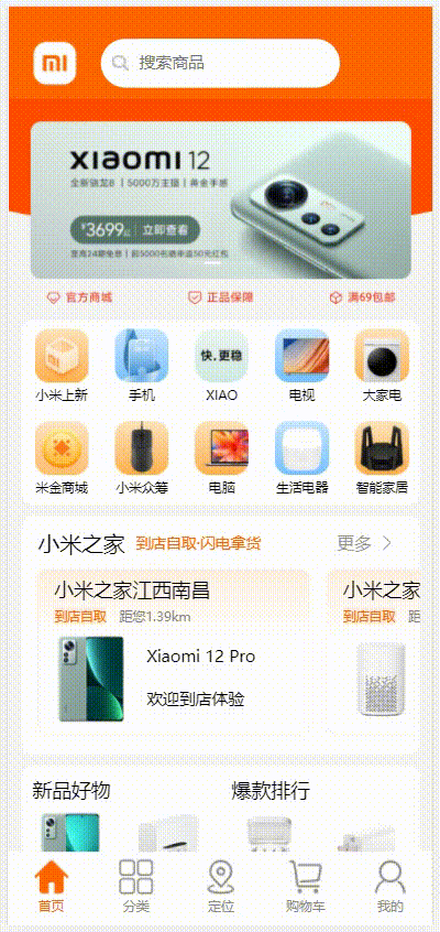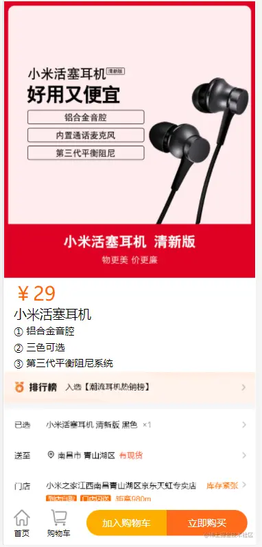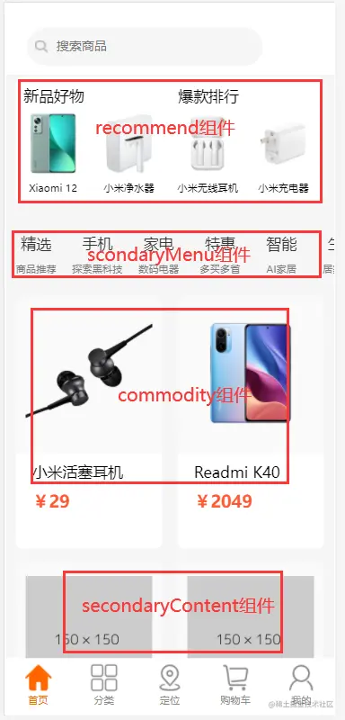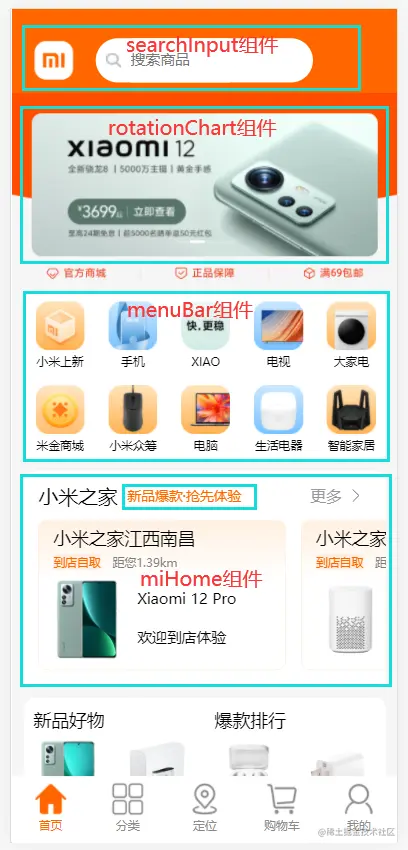 然后就是miHome组件,其中上图中框起来的小文字标题,也是使用的swiper组件,从而实现上下翻页切换。主题的miHome组件中的商品卡片整体也是使用的Bscroll,但是通过传参取消了默认的左右吸顶,从而可以实现与上面menuBar组件不一样的吸顶。