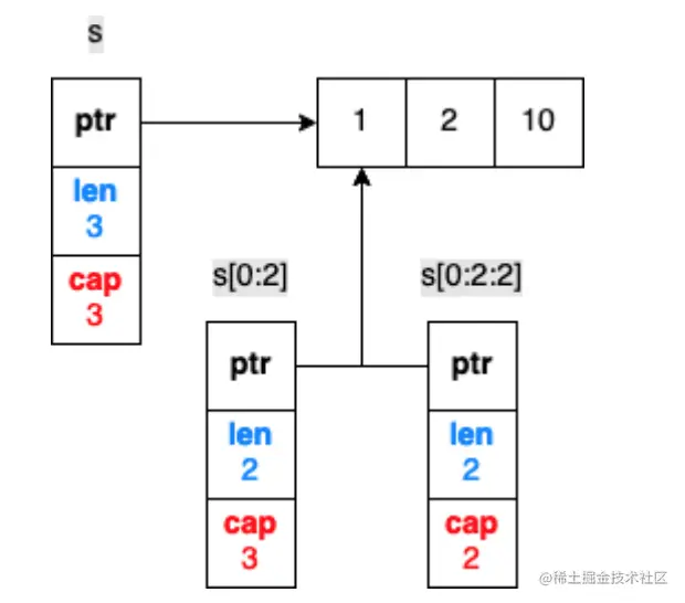 s1是长度为3,容量为3的切片结构,而s2是长度为1,容量为2的切片结构,s1和s2的都指向相同的底层数组。