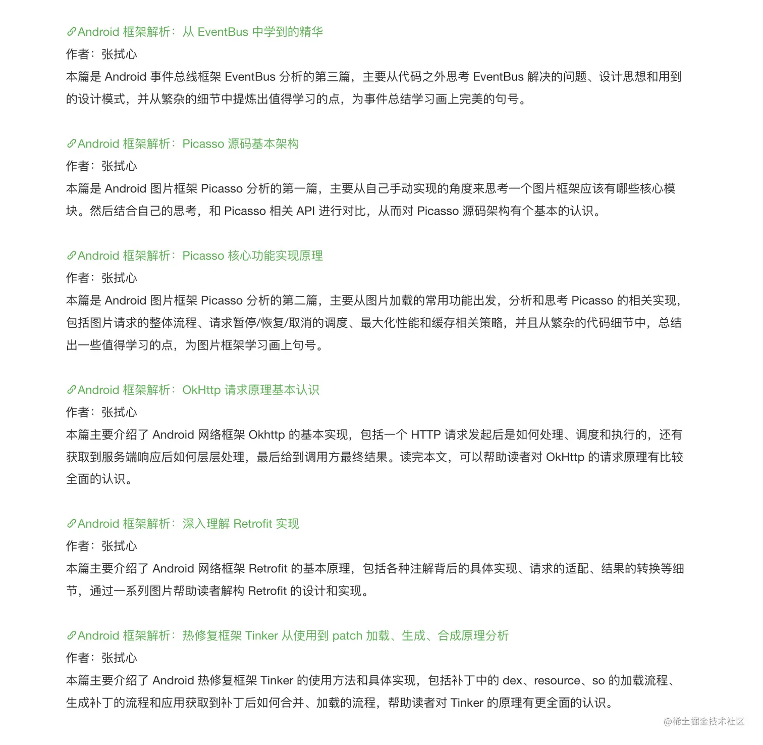 为了能够提升自己的技术,在这期间我学习了公司内外很多框架的源码,通过分析这些框架的优缺点、核心机制、架构层级、设计模式,对如何开发一个框架算是有了基本的认识,也输出了一些文章,比如 《Android 进阶之路:深入理解常用框架实现原理》。
