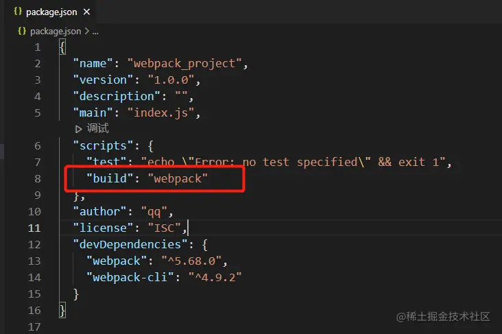 当然,为了方便起见,我们也可以将 npx webpack 命令配置在 package.json 中: