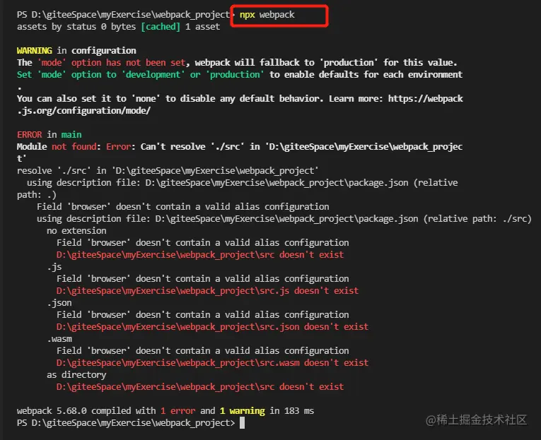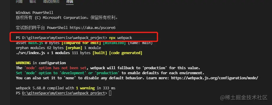 安装完后,我们可以使用 npx webpack 命令来运行项目中安装好的 webpack,实际上就是运行构建: