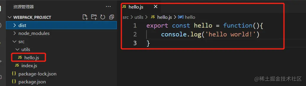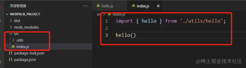 发现报错,导致这些错误的原因是因为我们并没有需要构建的代码,那么接下来我们手动添加2个代码文件,src/inex.js 和 src/utils/hello.js,其中 index.js 是对 hello.js 的引用: