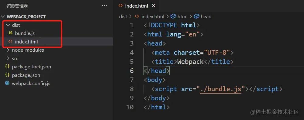 除此以外,由于 webpack 不能处理 html 文件,所以我们还需要一个 index.html 文件作为页面的基础,首先在 dist 目录下创建一个 index.html 文件: