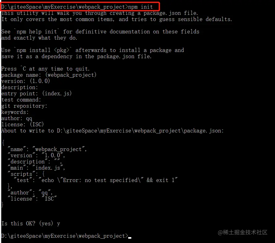 在 cmd 中打开该目录,使用 npm init 命令进行初始化。