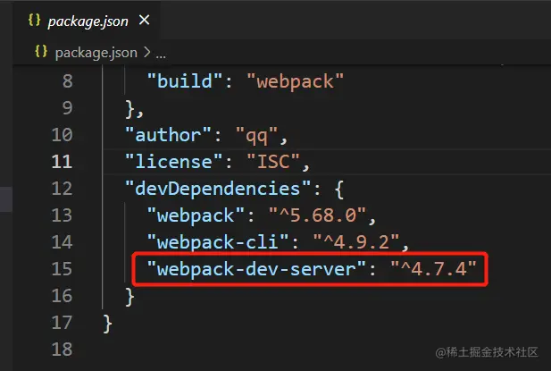 安装完以后,我们可以在 package.json 文件中看到对应的 webpack 版本依赖: