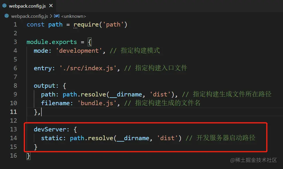 并且在 webpack.config.js 配置文件中添加指定开发服务器启动路径的配置: