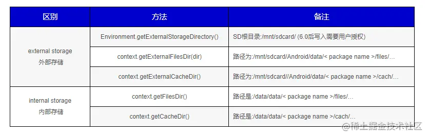 - 数据库: 使用持久性库将结构化数据存储在专用数据库中。 | | 内容类型 | 访问方法 | 所需权限 | 其他应用可访问? | 卸载时是否删除文件?| |-------|----------|--------|----------| -------------- | -------------------| |应用专属文件|仅供应用使用的文件 | 内部存储空间:getFilesDir()或getCacheDir() 外部存储空间:getExternalFileDir()或者getExternalCacheFileDir() | 内部存储空间不需要权限,如果应用在Android4.4及其以上运行,外部存储空间不需要权限 | 内部存储空间不能访问,外部存储空间可以访问 | 是 | | 媒体 | 可共享的媒体文件(图片、音频、视频) | MediaStore API | 在Android10(API 29)或者更高的版本访问其他应用的文件需要READ_EXTERNAL_STORAGE或WRITE_EXTERNAL_STORAGE权限(开启分区后,访问自己应用不需要权限),在Android9(API 28)或者一下访问所有文件均需要相关权限 | 是,但是其他应用需要READ_EXTERNAL_STIRAGE权限 | 否 | | 应用偏好设置 | 键值对 | SharedPreference | 无 | 否 | 是 | | 数据库 | 结构化数据 | ROOM持久库 | 无 | 否 | 是 |