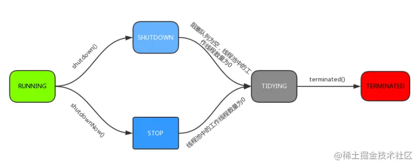 - STOP:停止状态,不能接受新任务,也不处理阻塞队列中的任务,会中断正在处理任务的线程。调用shutdownNow方法使线程池进入该状态。