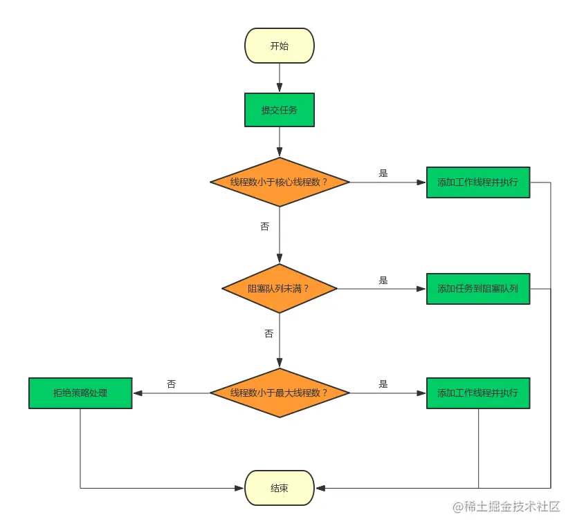 - 如果workerCount < corePoolSize,创建并启动一个核心线程来执行新提交的任务,如果addworker()启动线程失败(方法中会对线程池状态进行判断),则判断线程池是否处于运行状态并且将任务入队,如果为真:再次判断线程池如果不是运行状态,那么将该任务移除队列(前边已经加入队列了)并且将抛出该任务执行饱和策略,如果是运行状态,判断当前有效线程是否为0 ,为0:开启额外线程(这里开启线程addworker(null,false),不将任务传入进去是因为任务已经入队了,线程里直接取队列的任务),不为0:不做任何处理,因为核心线程执行完之后也会去取队列中的任务。如果为假: 将开启额外线程处理该任务,如果处理失败,抛出该任务执行饱和策略。