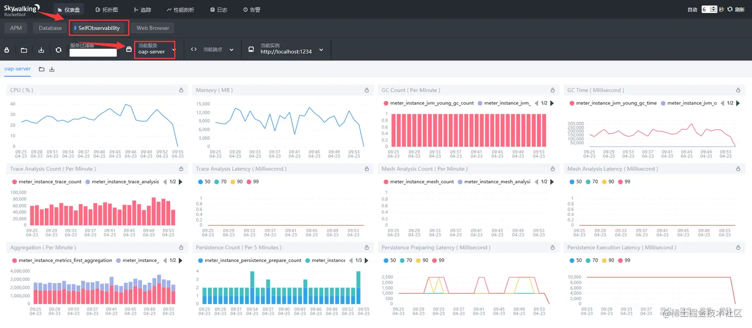 在 UI 中选择 SelfObservability ,然后在服务列表中选择 oap-server ,效果如下图: