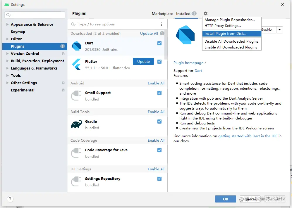在Android Studio中安装插件时,打开插件首选项 (macOS:Preferences>Plugins, Windows:File>Settings>Plugins),始终加载不出来Flutter和Dart插件,此时去IDEA官网Developer Tools>All Plugins中搜索插件,选择versions>Compatibility with Android Studio 下载版本和自己安装Android Studio版本对应的版本install到Android Studio中即可(不是直接下载最新版)