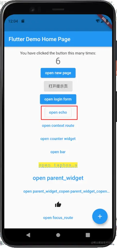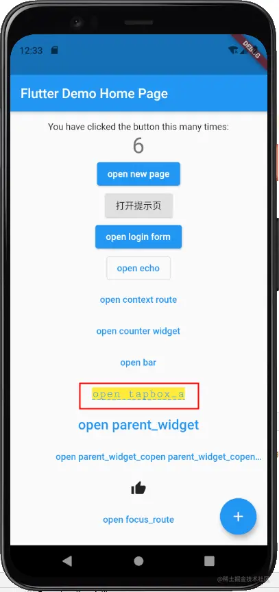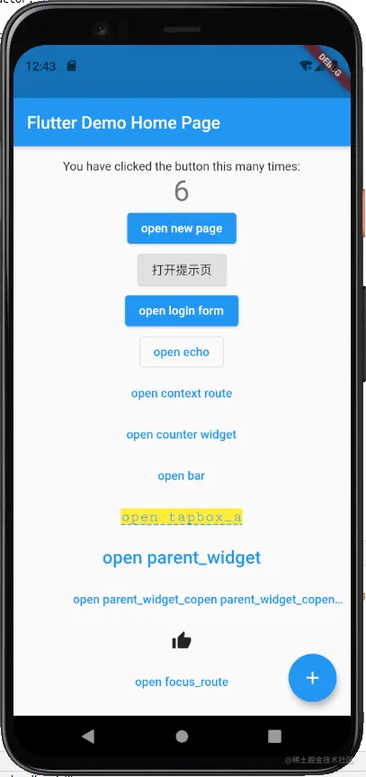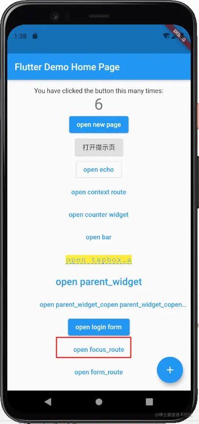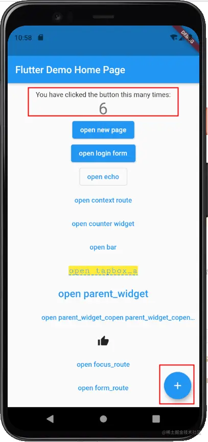 该计数器示例中,每点击一次右下角带“+”号的悬浮按钮,屏幕中央的数字就会加1。