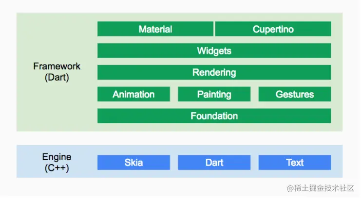 - 底下两层(Foundation和Animation、Painting、Gestures)在Google的一些视频中被合并为一个dart UI层,对应的是Flutter中的