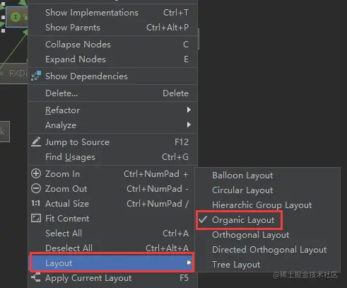 默认的子类层级关系图看不清,这里,可以通过IDEA右键Callable接口,选择“Layout”来指定Callable接口的实现类图的不同结构,如下所示。