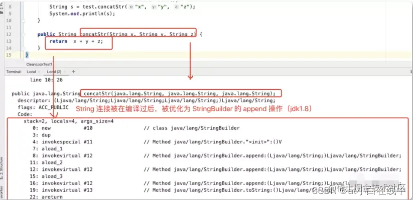 这里大家可能会担心 StringBuilder不是线程安全的的操作会存在线程安全的问题吗?这里的答案是不会,x + y + z操作的优化**「经过逃逸分析」过后,他的动态作用域被限制在了 concatStr方法内,就是说当前实际执行的 StringBuilder 的操作在 concatStr 方法内部,「其他的外部线程无法访问」到,所以这里「虽然有锁,但是可以被安全的消除掉。所以当我们进行编译过后,这段代码就会忽略掉所有的同步措施直接执行。」**