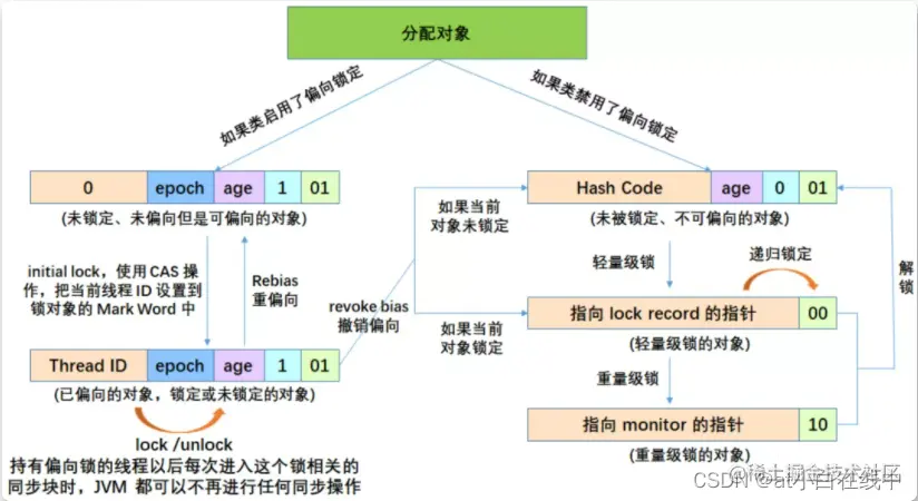 偏向锁、轻量级锁的状态转化及对象 Mark Word 的关系转换入下图所示: