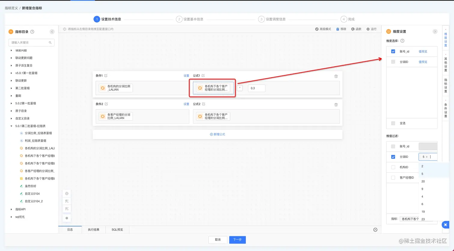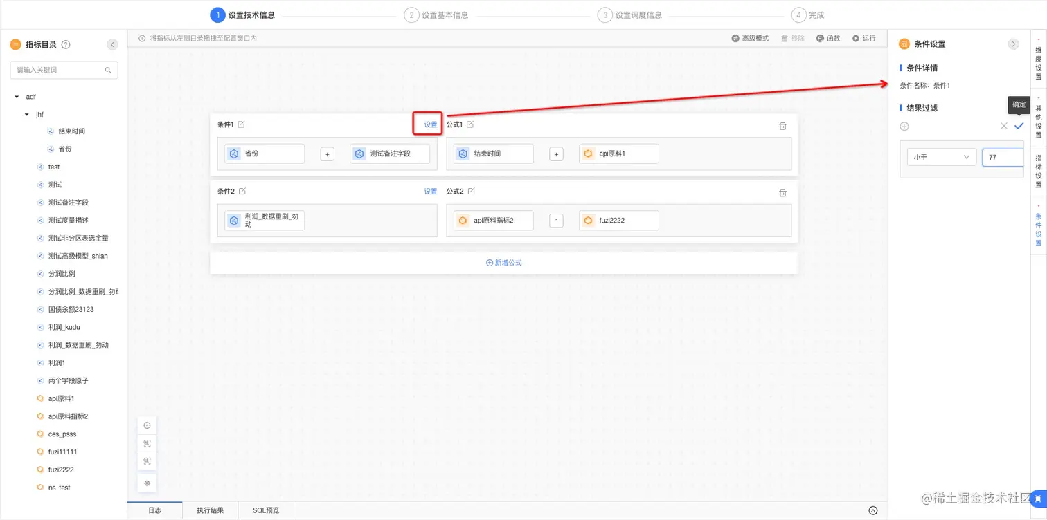 查看是指从指标列表里的某个复合指标右侧的“编辑”操作进入编辑页面,可以看到上次保存的配置好的公式信息,选中不同指标、点击不同条件的设置,会回显出上一次你保存的结果过滤信息。