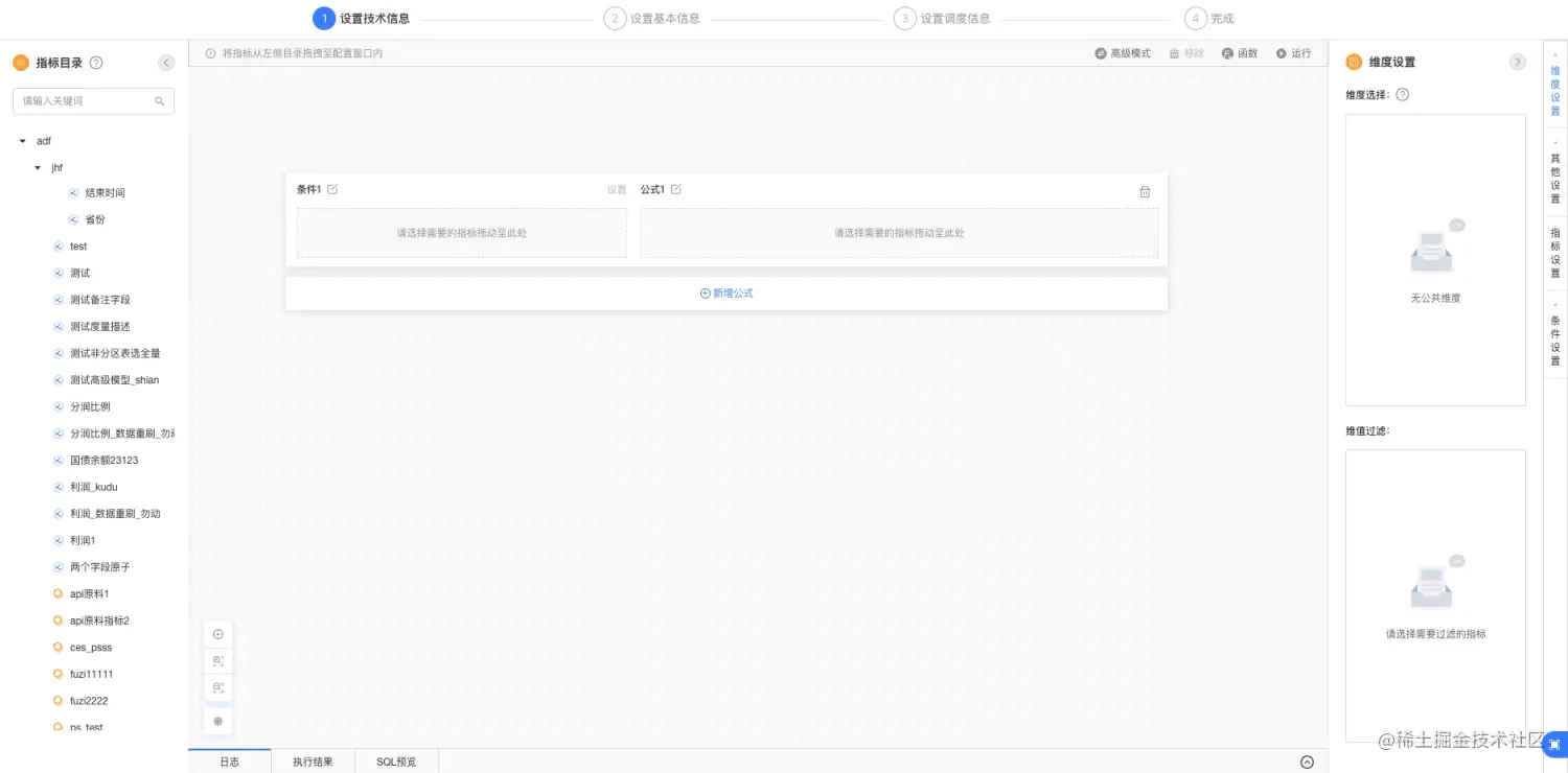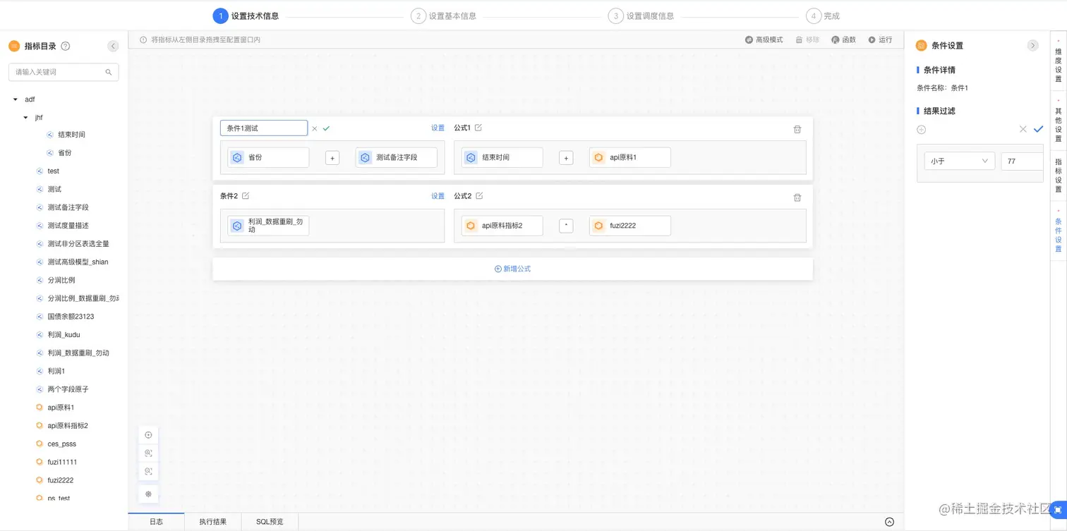 如图3-2所示,我们可以点击对应指标将其选中,对这个选中指标进行结果过滤设置;如图3-3所示,我们可以点击条件右上角的“设置”按钮,对当前条件进行结果过滤设置;可以点击条件或者公式后的图标,对条件名、公式名进行编辑;如图3-5所示,点击维度设置,可以对当前所有加入到画布中的指标的公共维度进行设置,与此同时选中某一个指标,可以对当前选中指标进行维值过滤设置。