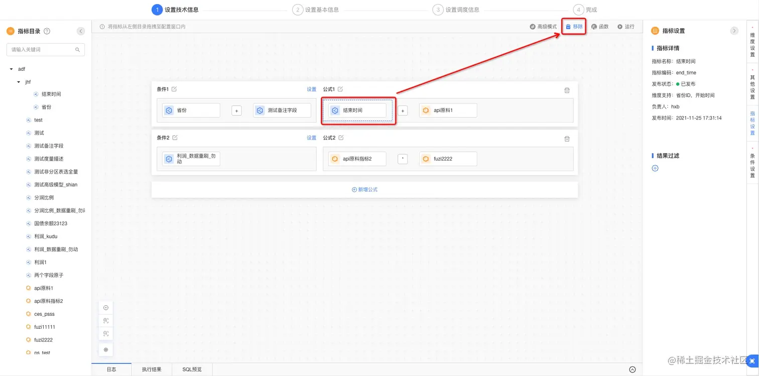 如图3-5所示,可以在选中某一个指标之后,点击窗口右上角的“删除”按钮,将选中指标从当前公式中删除,最终得到的结果如图3-6所示;同样可以点击公式右边的删除图标,会将当前一整条公式(包含条件、公式)都删除。
