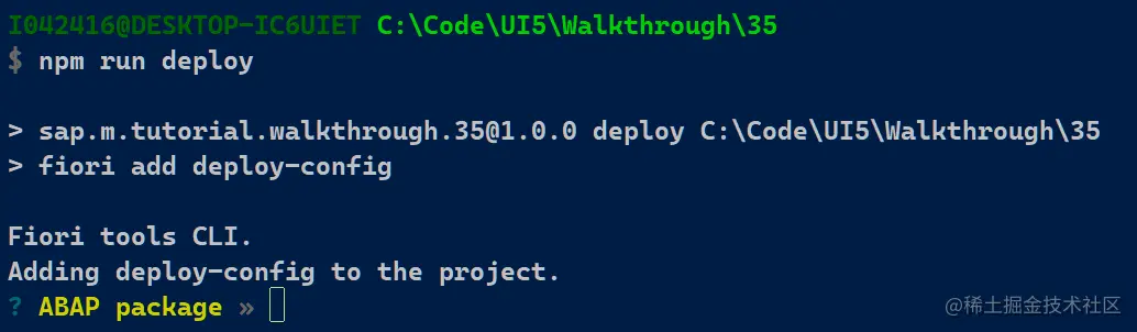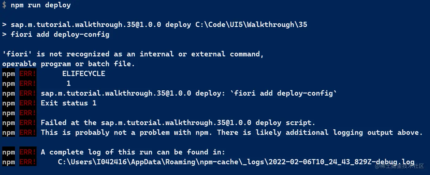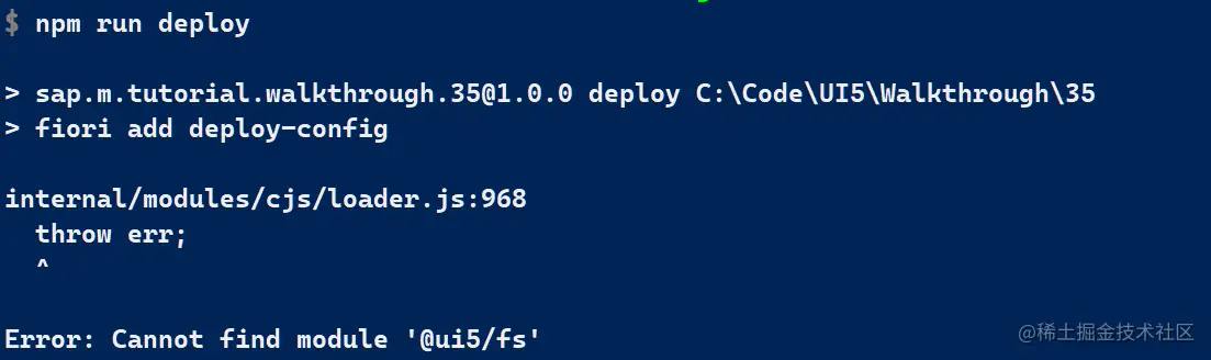 添加后运行 npm install,然后 fiori add deploy-config, 遇到新的错误消息:
