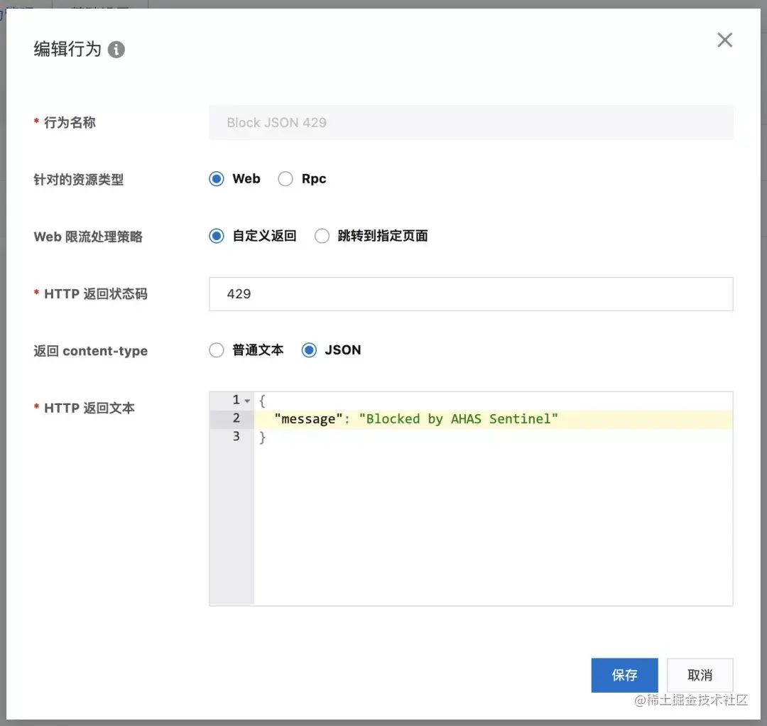 第三步,我们给上面的 Web 流控规则绑定一个 fallback 行为**[7]**,即指定触发该规则后,Web 接口的返回内容。我们可以在页面中自定义 Web 返回行为。以下是一个返回 429 状态码的 JSON 返回配置示例: