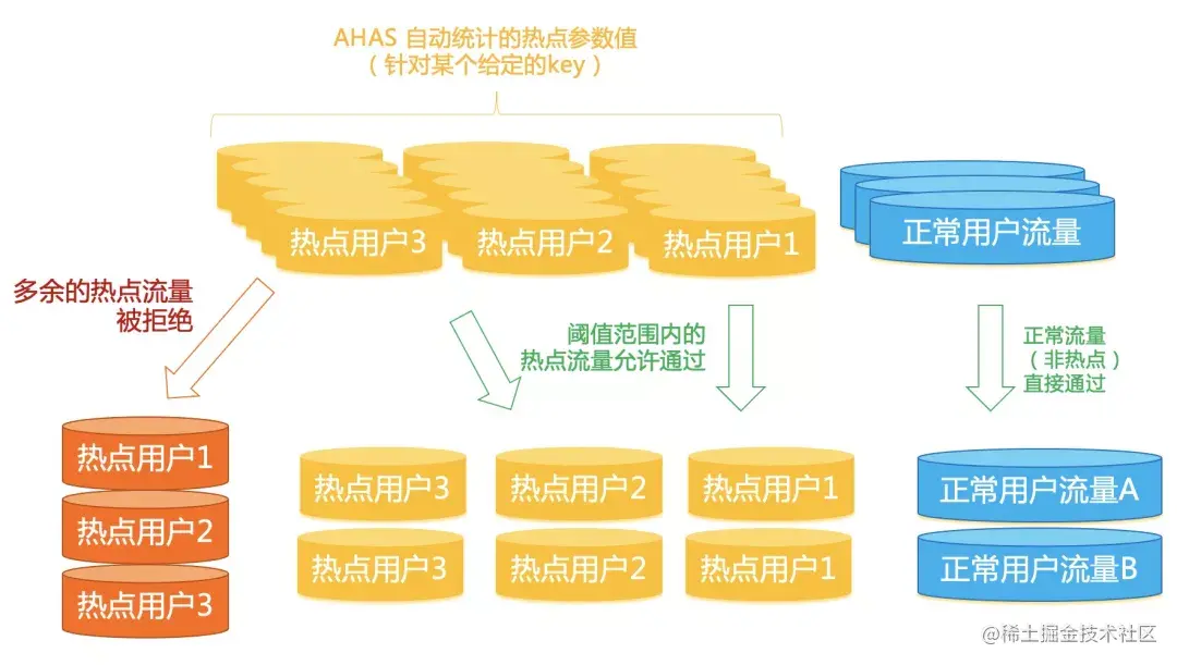 每个服务都有一个能承载的最大请求容量,这个容量通常压测进行评估。在突发激增流量的场景下,我们需要针对核心 Web API 配置流控规则,来保障系统流量处于有效的处理能力之内,避免被打垮。同时,Web 流量通常具有非常多的业务属性与参数,如 IP、用户 ID、商品 ID 等,许多请求都具有一定的热点特性,比如一大波请求针对某个热点商品。由于流量具有不确定性、不可预测的特性,我们无法准确预知流量的量级、分布、热点访问情况,很难针对性地针对某个突发业务提前预判并配置防护,因此自动识别热点请求能力也是非常重要的。