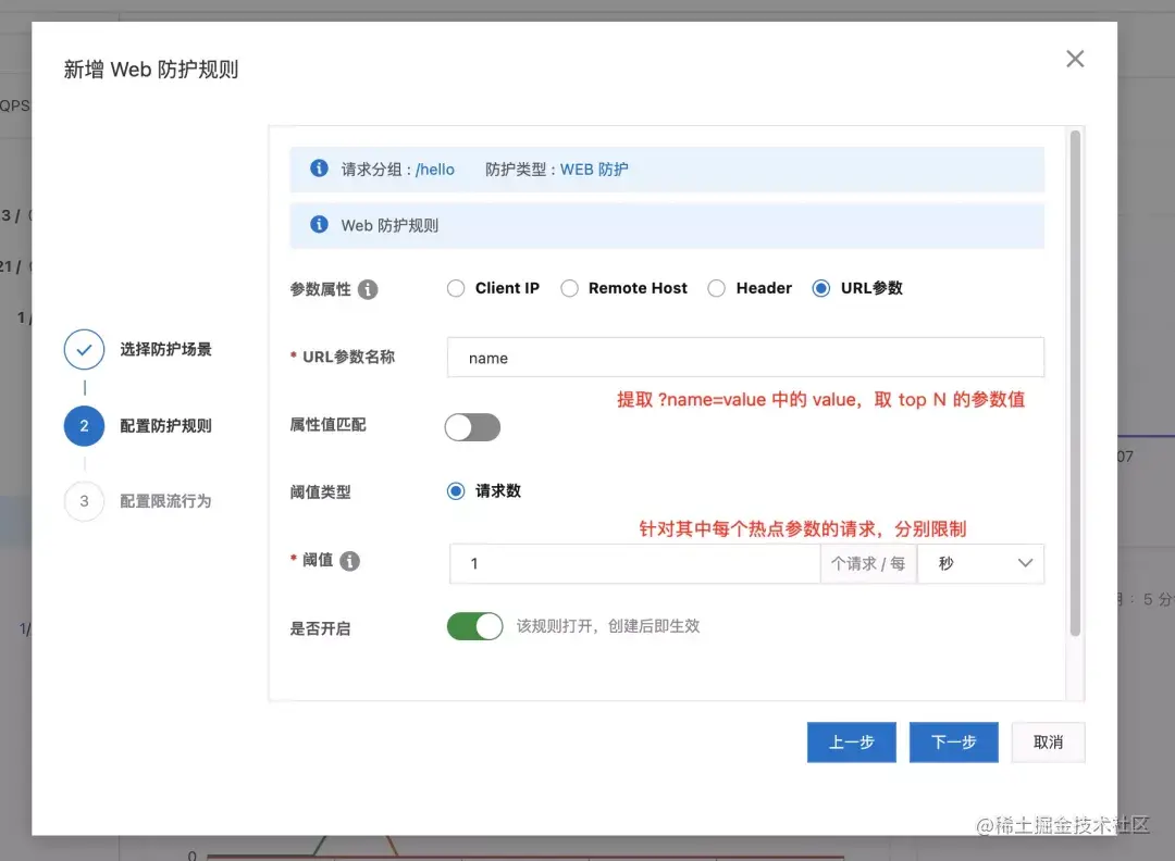 第二步,我们给其中一个接口配置 Web 流控规则**[6]**。在我们的示例中,我们针对 /hello 这个 API,配置热点参数流控。流控的请求属性为 name 这个请求参数(URL params),流控策略为每个热点参数分别限制每秒访问量最多 1 次。AHAS 会自动提取每个 /hello 请求中的 name 参数对应的值,自动分析出其中 top K 频次的热点值,然后分别对每个热点值进行控制,不超过规则中的访问次数。