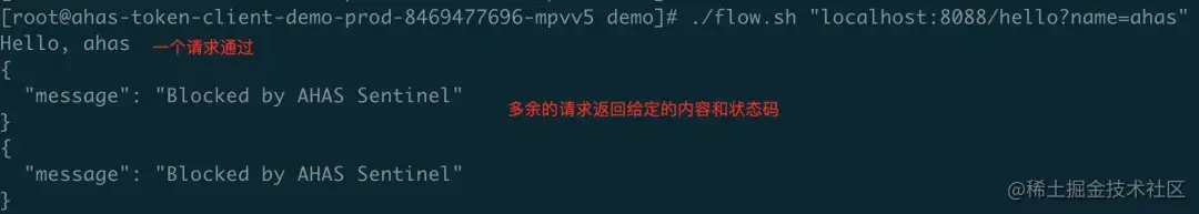 第四步,我们发起针对 /hello 接口的流量,并给 name 参数带上不同的值,可以从控制台的监控上面看到请求触发了流控: