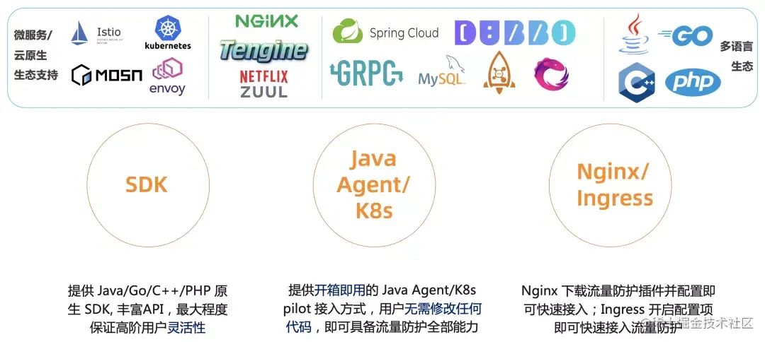 AHAS 应用防护支持 Java/Go 等多语言原生接入,支持主流的 Web 框架与组件: