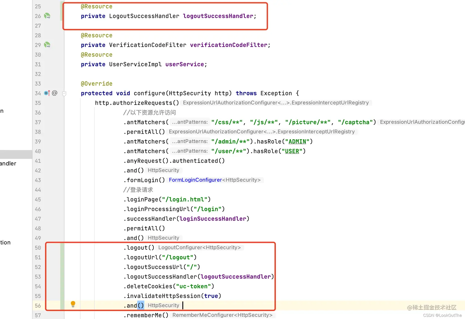 退出登录和登录很类似,我们也是修改配置,指定退出登录请求的URL,用户通过访问该路由可以安全地注销其登录状态,包括使 HttpSession失效、清空已配置的Remember-me验证,以及清空SecurityContextHolder,并在注销成功之 后重定向到/login?logout页面。 如有必要,还可以重新配置。